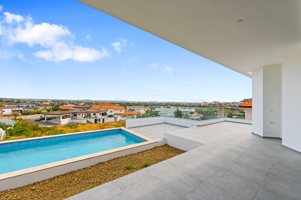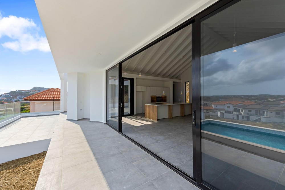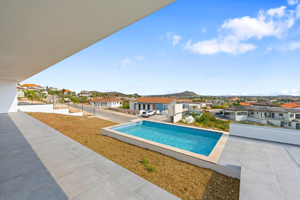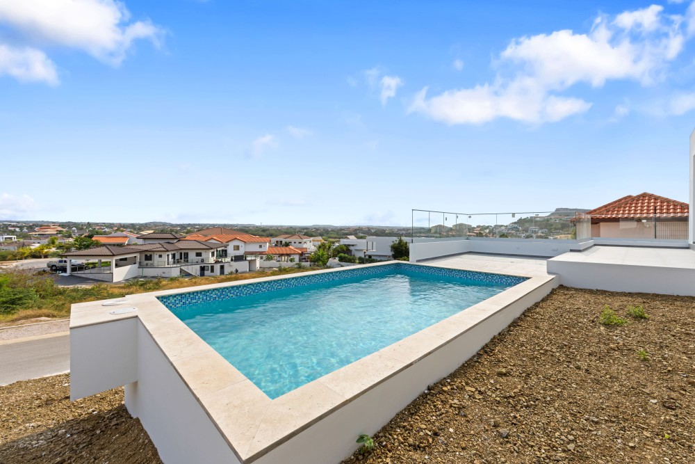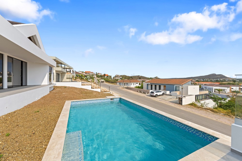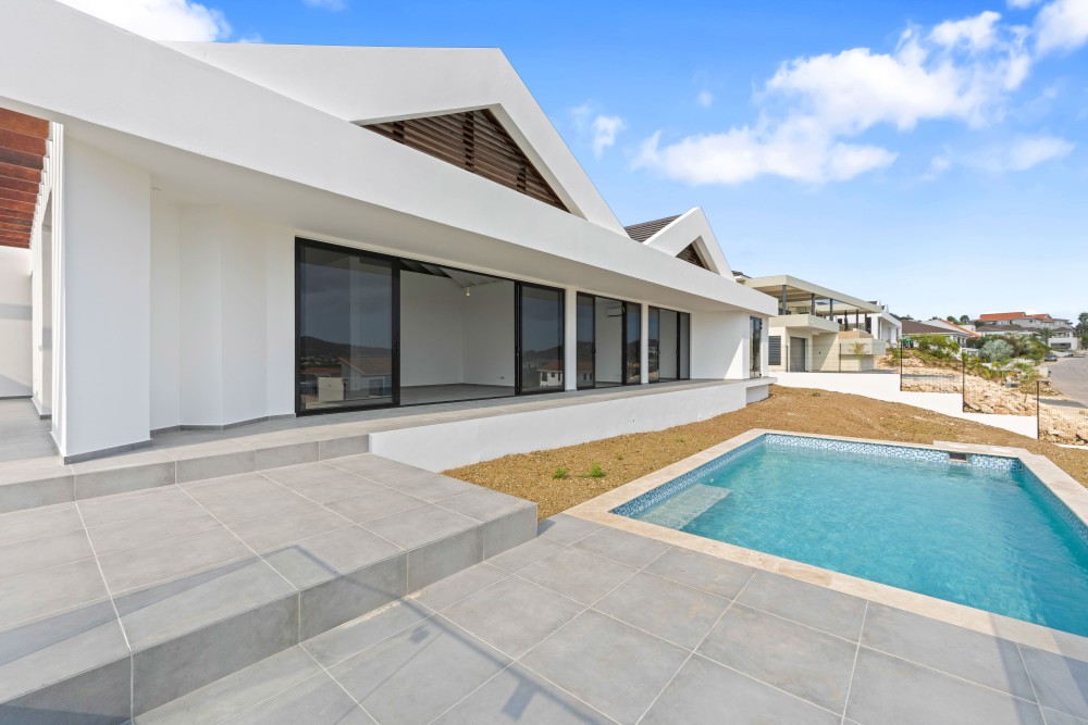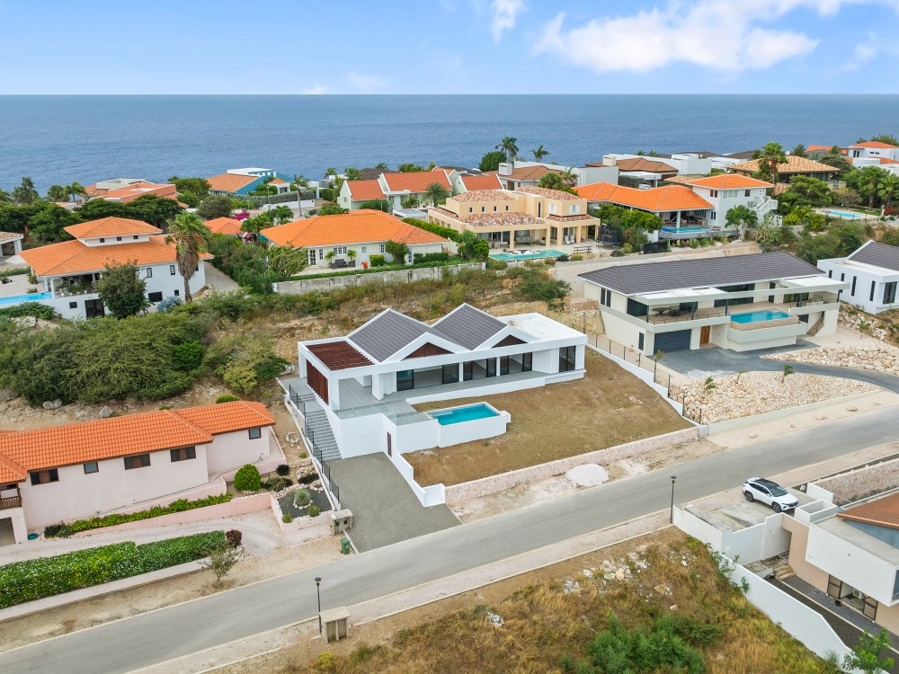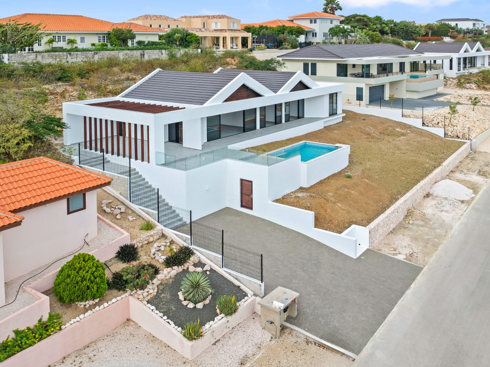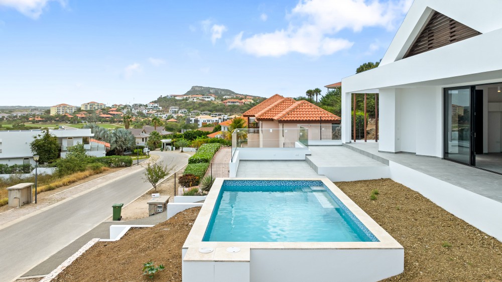 We proudly present this new (to be built) luxury villa at Blue Bay Resort lot BD-51. The villa has an elevated location with views, and a lovely private pool. Upon entering the house on the right-hand side, you immediately enter the beautiful, open kitchen with a large cooking island. There is enough space for a dining table and there are glass sliding doors that open up to the covered porch. The spacious living room in in the same living area and also has large windows to enjoy the view and plenty of living space.Furthermore, the house has 3 bedrooms and 3.5 bathrooms. When you walk through the hallway all the way to the back, you arrive at the master bedroom with its own spacious bathroom and walk-in closet. The patio doors give access to the outside and the view over the resort.The other 2 bedrooms are identical and each has its own luxurious bathroom. All bedrooms have air-conditioning. In the central hallway there is a guest lavatory and a separate storage room, perfect for the washing machine and dryer.The sliding doors from the kitchen to the terrace create an open living space where you will spend most of your time. From the covered terrace you can overlook the garden and the private pool. Next to the road is the illuminated and paved parking lot where you can park several cars, from here you can walk to the house with a staircase.The villa has an elevated location and offers beautiful views over the resort.The villa will be delivered including a swimming pool but without landscaping.We have 2 video’s to give you a good look at the villa: Click here for the first video and here for the second!Interested? This is a great opportunity to own your private villa at Blue Bay Resort. Don’t hesitate and call the listing agent for more information!House no.: hs2487