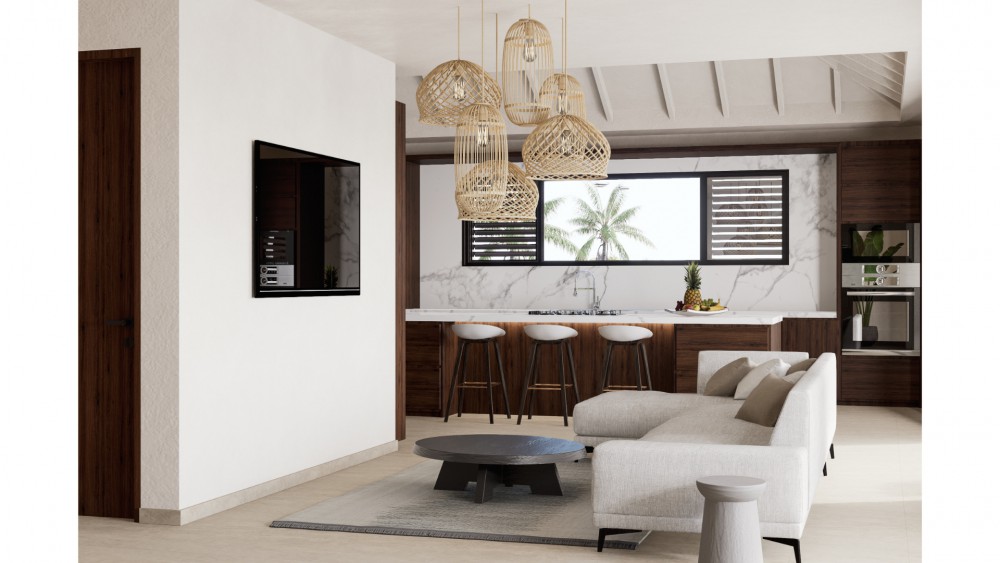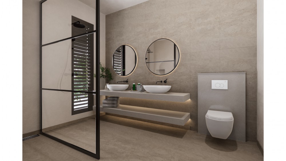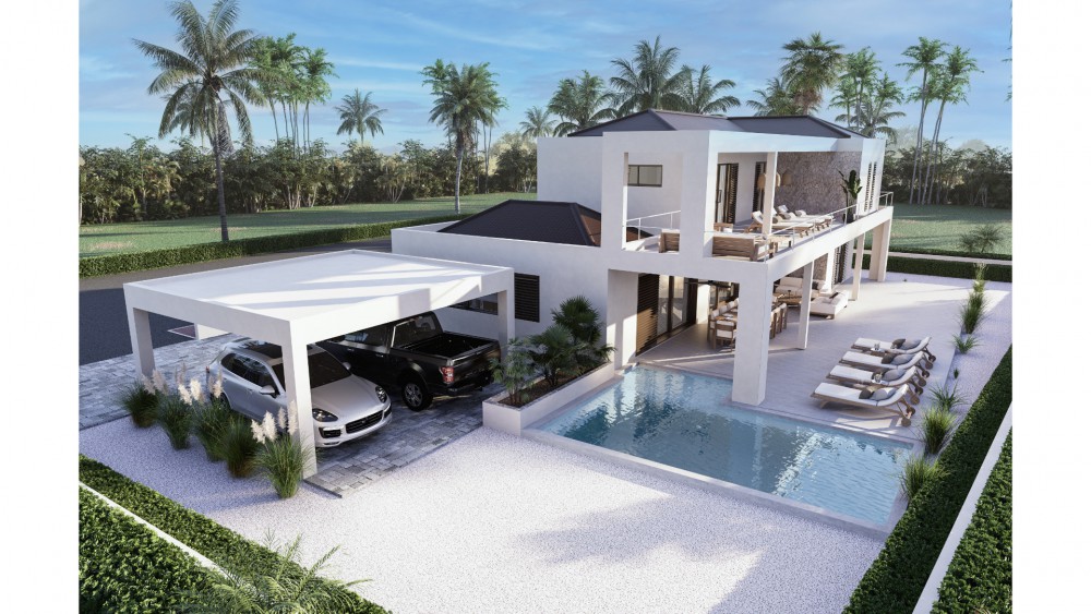 Through the impressive entrance you enter the living room with an adjacent spacious open kitchen. The kitchen has been carefully designed and equipped with all modern conveniences, including a spacious cooking island, an electric hob, a dishwasher, a combination oven and a fridge/freezer combination.The living room extends into a large terrace (130m2), of which 60m2 is covered. The sliding doors can be completely retracted into the walls, making the inside feel like outside.The villa is built well on the wind, which ensures a cooling breeze, the spacious porch offers plenty of shade where you can relax and offers enough space for a lounge set and dining table. To the left of the terrace is a lovely swimming pool with lounge deck to enjoy the necessary cooling and the Caribbean outdoor life.The master bedroom is located in the left wing of the house, which has been designed with an eye for detail and comfort. From here you also have direct access to the porch with an amazing view. This master bedroom has a spacious walk-in closet that offers sufficient storage space for all your clothing and accessories and a spacious bathroom equipped with a double sink, a walk-in shower and a toilet.Downstairs there is a laundry room/utility room and a separate guest toilet.The stairs in the hall lead you to the upper floor where on the right you will find another very spacious bedroom with an adjacent spacious walk-in closet with private bathroom. The bathroom has a double sink, a walk-in shower and a toilet.The two other spacious bedrooms share an equally tasteful bathroom, again with a double sink, a walk-in shower and a toilet. This offers residents of this home all comfort and luxury.Through the hall you have access to the amazing second roof terrace with pergola with beautiful views and which offers plenty of space for sun beds and a complete lounge set.Next to the house there is enough space for a beautiful carport that is suitable for parking two cars, so that your vehicles are sheltered. This is optional and can be built in consultation.In short, a luxuriously finished, modern and maintenance-friendly villa where the design takes into account the possibility of holiday rental. A very interesting investment.