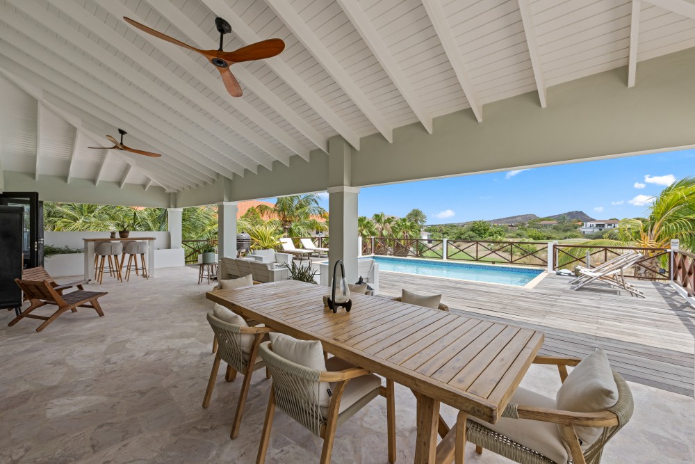 The property is available for a limited period, from April 15 until November 15.Upon entering, you are immediately welcomed into the spacious living room with high ceilings and a bright, open feel. The large sliding doors can be fully opened, seamlessly blending indoor and outdoor living into one generous living space. The modern open kitchen is equipped with high-quality European appliances and offers all the conveniences you need.The villa features two comfortable bedrooms. The master bedroom includes built-in closets and a spacious, modern en-suite bathroom with a shower, toilet, and stylish vanity. The second bedroom is of similar size and uses a second modern bathroom, ideal for guests. Additionally, there is an extra room that can serve perfectly as an office or guest room, equipped with a sofa bed. A separate guest toilet is also available.The outdoor area is sleek and low-maintenance, with multiple seating areas where you can enjoy both sun and shade. The swimming pool is the focal point of the garden, offering a perfect spot to relax at any time of day. Under the spacious palapa, you can comfortably enjoy the shade and the cooling trade winds. The property also provides ample parking, including a large carport.The villa is fully equipped with modern (inverter) air conditioning. The practical layout, open design, unobstructed views, and constant breeze together create an exceptionally comfortable and relaxing living experience. The tropical garden is planted with low-maintenance greenery, allowing you to enjoy it fully without high costs for water or upkeep.Interested? Feel free to contact us for more information or to schedule a viewing.