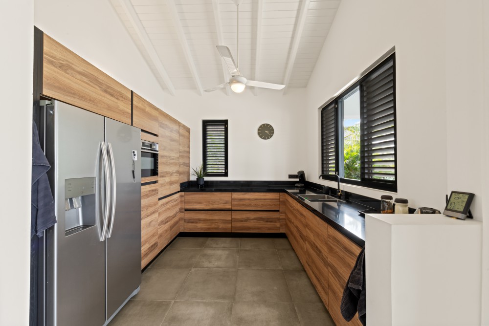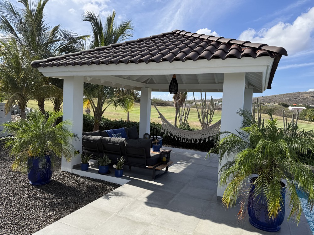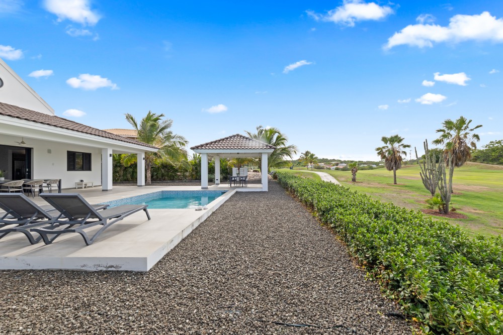Upon entering through the main entrance, you step directly into the spacious living room with high ceilings and a bright, open feel. Large sliding doors can be fully opened, allowing indoor and outdoor living to flow seamlessly into one generous living space. The modern open-plan kitchen is fitted with all necessary high-quality European built-in appliances.The villa offers three bedrooms. The master bedroom features ample built-in closets and a modern, spacious en-suite bathroom with shower, toilet, and stylish vanity. The two additional bedrooms are of similar size and share a second modern guest bathroom. One of the rooms can also be perfectly used as a home office or hobby room, thanks to its practical layout and pleasant natural light.The garden is sleek and low-maintenance, with multiple seating areas to enjoy both sun and shade. The swimming pool is the focal point of the outdoor space, ideal for relaxing at any time of the day. There is ample parking available on the property for multiple vehicles.The home is fully equipped with modern inverter air-conditioning units, a pantry with connections for a washing machine and dryer, and fitted insect screens throughout, allowing you to enjoy the refreshing trade winds throughout the villa without disturbance.The practical layout, open design, constant breeze, and unobstructed views over the golf course make this villa exceptionally comfortable and inviting. The tropical garden is planted with low-maintenance plants and trees, offering an authentic tropical experience while keeping water and garden maintenance costs low.Should you have any further questions or wish to receive more information or schedule a viewing on site, please feel free to contact the listing agent.House no.: hr2161