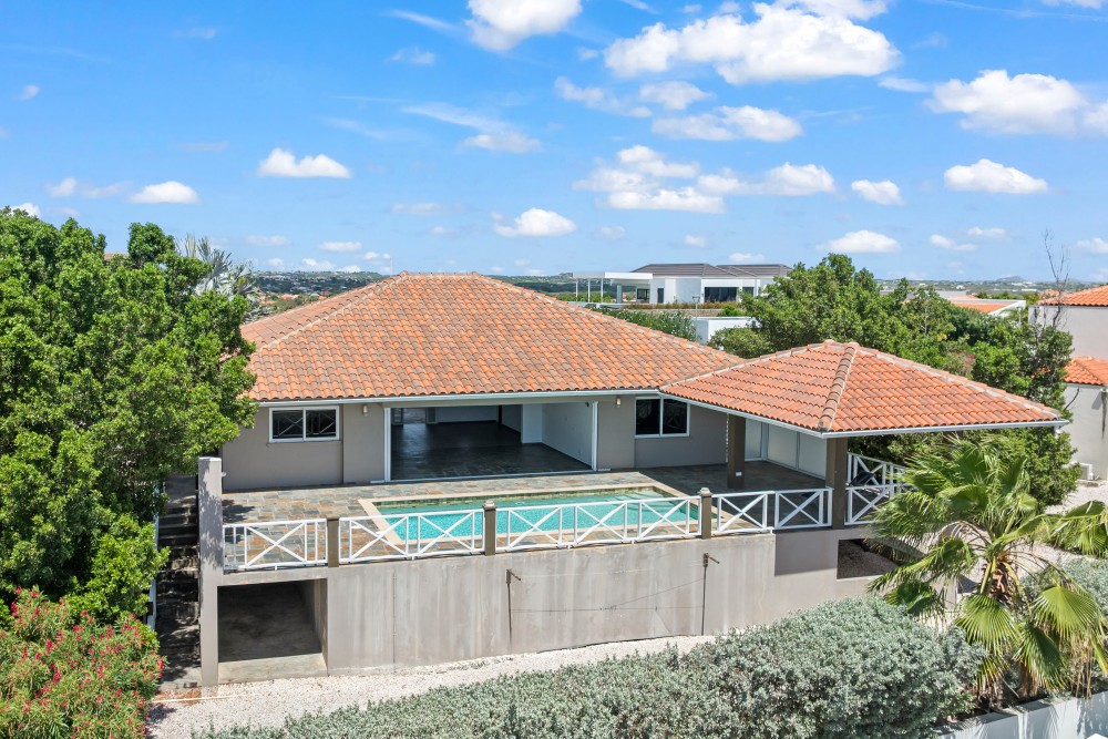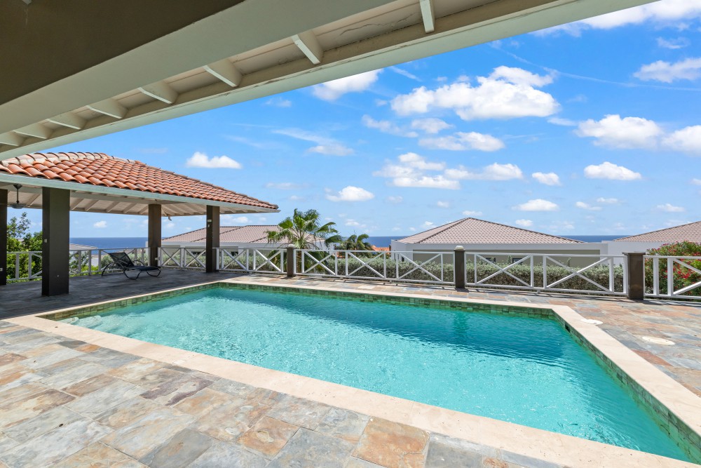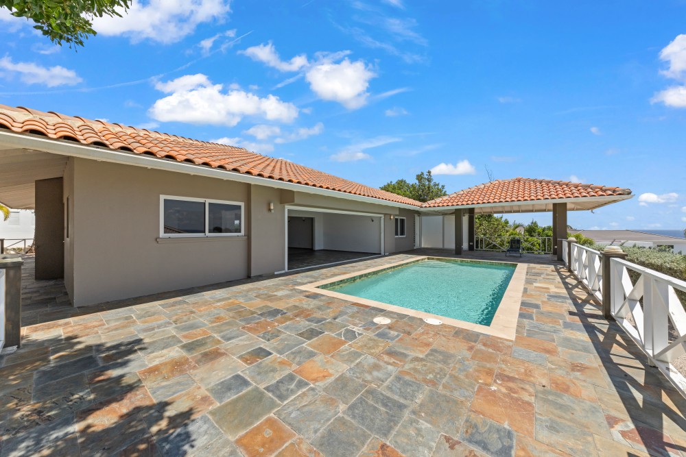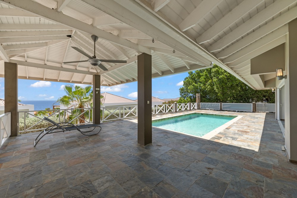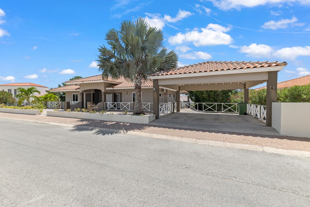 The villa is solidly built and features an impressive entrance, a wrap-around gallery, a carport with parking for two large vehicles, and a lush, mature garden.Upon entering, you are welcomed into the bright living and dining area with a stunning view over the pool and the Caribbean Sea. The high ceiling enhances the spacious feel of the villa. Thanks to the large sliding doors, the indoor and outdoor areas merge into one harmonious living space.The pool is located on the covered porch, offering the perfect spot to relax and enjoy Caribbean outdoor living with breathtaking sea views.Adjacent to the living area are three bedrooms. The master suite features a private en-suite bathroom and a spacious walk-in closet. The two well-sized guest bedrooms share a full bathroom.The kitchen is equipped with all necessary built-in appliances. Next to it, a practical pantry offers connections for a washer and dryer as well as additional storage space. A side door connects directly to the carport, ideal for unloading groceries.With a bit of Tender Love and Care, this well-built villa, its functional layout, and prime location within the coveted B-section of Blue Bay Golf & Beach Resort can easily be transformed into a beautiful permanent or vacation home.Listing agents Derek and Marcel are happy to provide additional information or schedule a viewing.