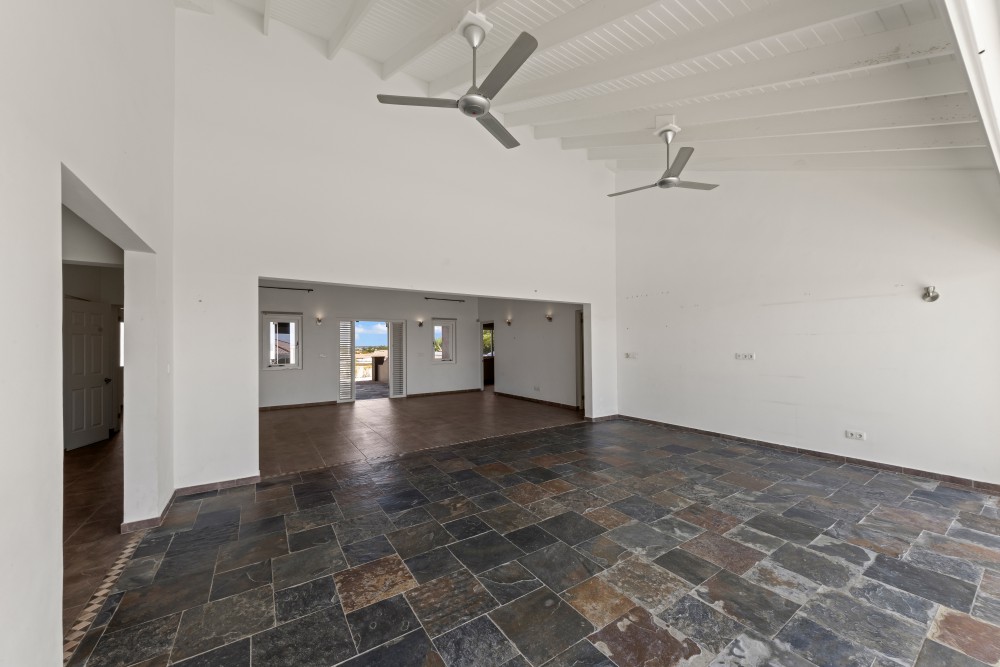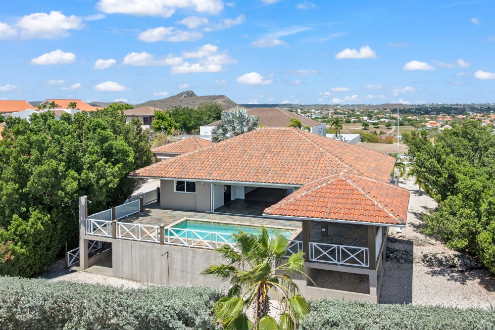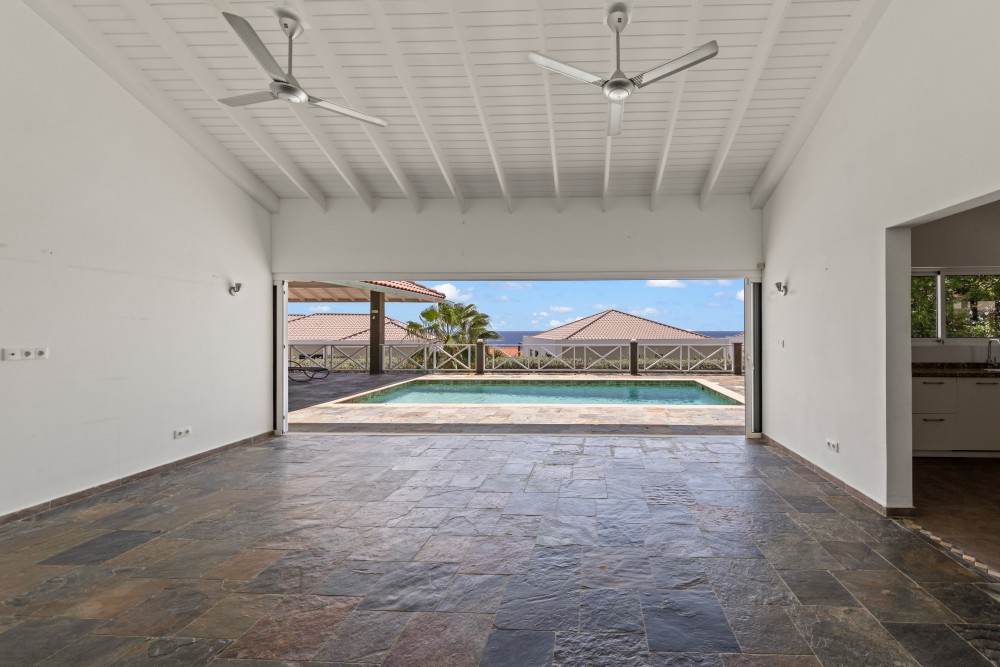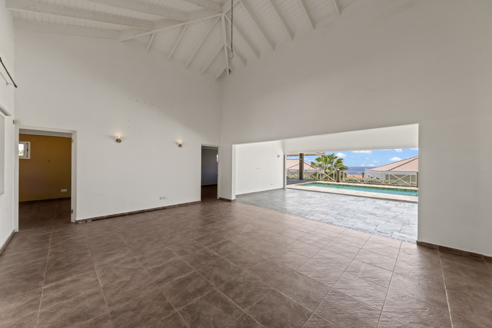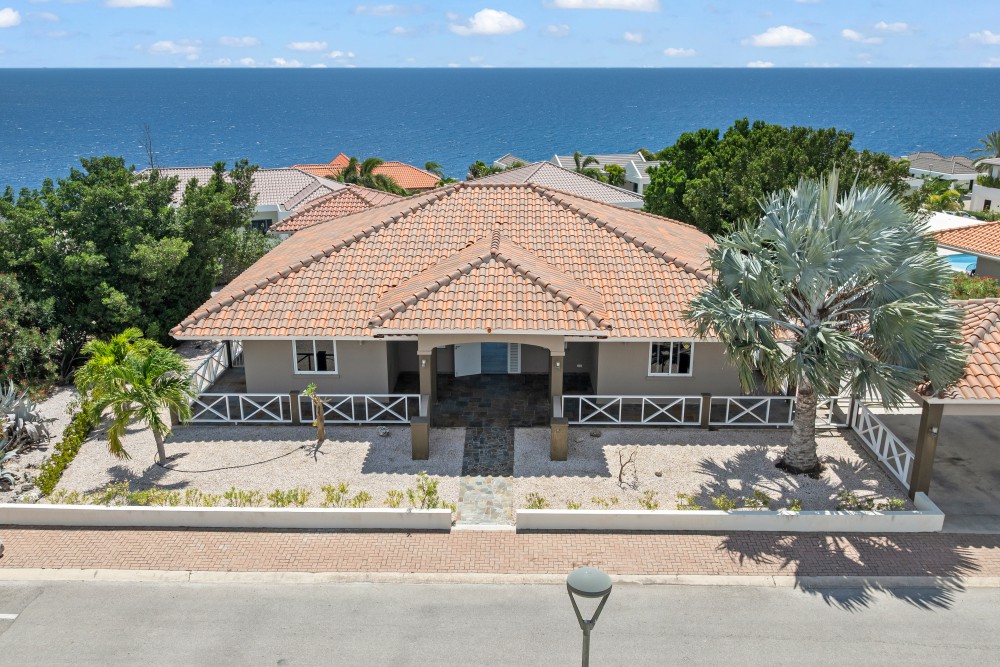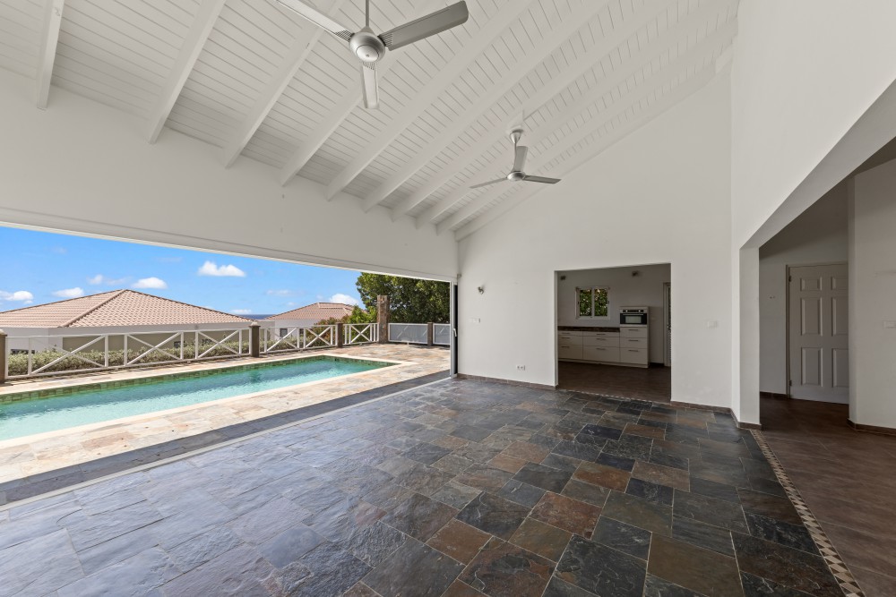 The villa is solidly built and features an impressive entrance, a wrap-around gallery, a carport with parking for two large vehicles, and a lush, mature garden.Upon entering, you are welcomed into the bright living and dining area with a stunning view over the pool and the Caribbean Sea. The high ceiling enhances the spacious feel of the villa. Thanks to the large sliding doors, the indoor and outdoor areas merge into one harmonious living space.The pool is located on the covered porch, offering the perfect spot to relax and enjoy Caribbean outdoor living with breathtaking sea views.Adjacent to the living area are three bedrooms. The master suite features a private en-suite bathroom and a spacious walk-in closet. The two well-sized guest bedrooms share a full bathroom.The kitchen is equipped with all necessary built-in appliances. Next to it, a practical pantry offers connections for a washer and dryer as well as additional storage space. A side door connects directly to the carport, ideal for unloading groceries.With a bit of Tender Love and Care, this well-built villa, its functional layout, and prime location within the coveted B-section of Blue Bay Golf & Beach Resort can easily be transformed into a beautiful permanent or vacation home.Listing agents Derek and Marcel are happy to provide additional information or schedule a viewing.