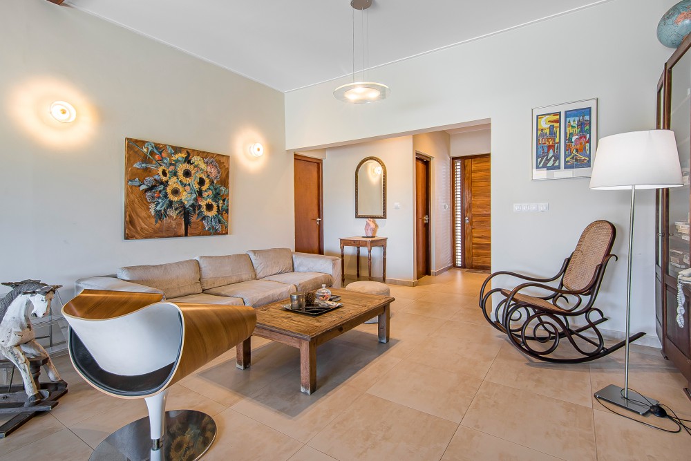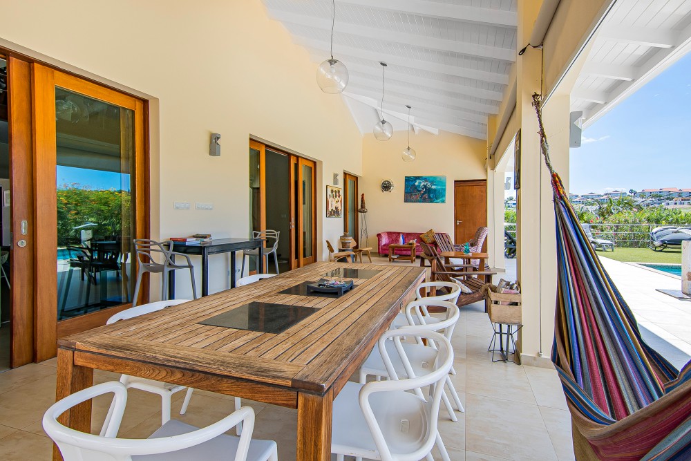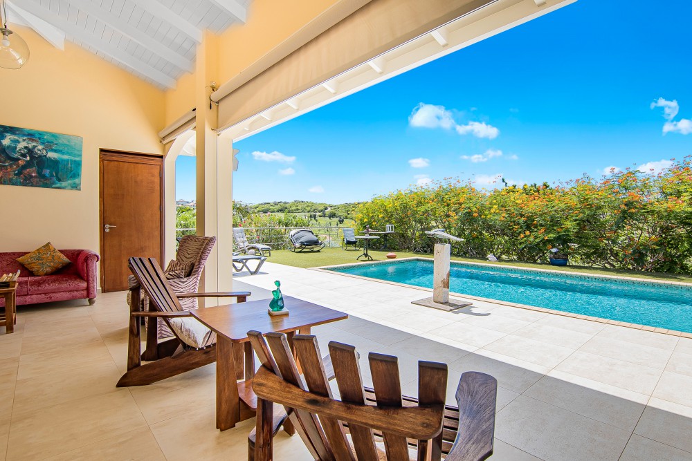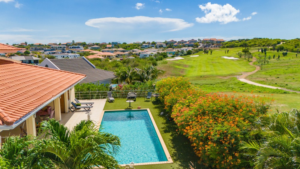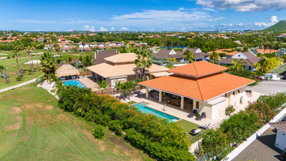 Upon entering this stunning home, you step into the entrance hall, where the house immediately opens up to various rooms. To the right, you will find the first spacious bedroom, complete with a private bathroom, which also serves as a guest bathroom.To the left of the entrance are the additional bedrooms, including a comfortable second bedroom and the spacious master bedroom. The master bedroom features French doors that provide direct access to the covered back porch and swimming pool, allowing you to step straight into the open air. It also includes a private en-suite bathroom.The spacious living room is characterized by its abundant natural light and high ceilings. The large sliding doors seamlessly connect the covered back porch with the living area, creating one expansive space. The generous porch offers ample room for relaxation and dining. Adjacent to the living room is a well-appointed kitchen, fully equipped with high-end built-in appliances.A staircase leads to the mezzanine, providing a beautiful view over the living areas below. The mezzanine offers plenty of possibilities, such as a fourth bedroom, private retreat, or office space, adding an extra dimension to the home’s living comfort.This residence borders the golf course, yet ensures complete privacy, thanks to strategically placed trees, allowing you to fully enjoy your terrace and private swimming pool.